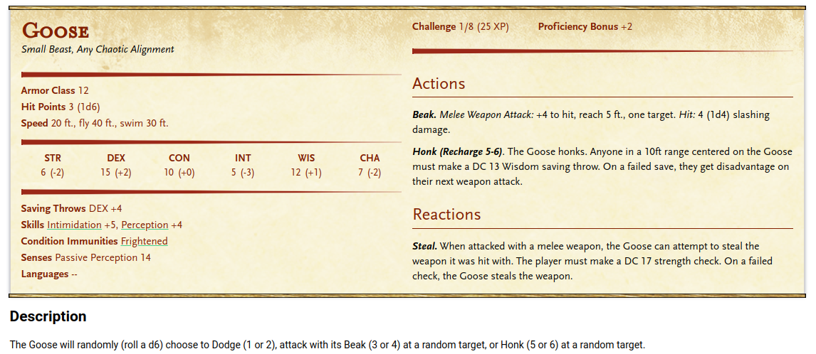 The goose from the Untitled Goose Game as a D&D monster.